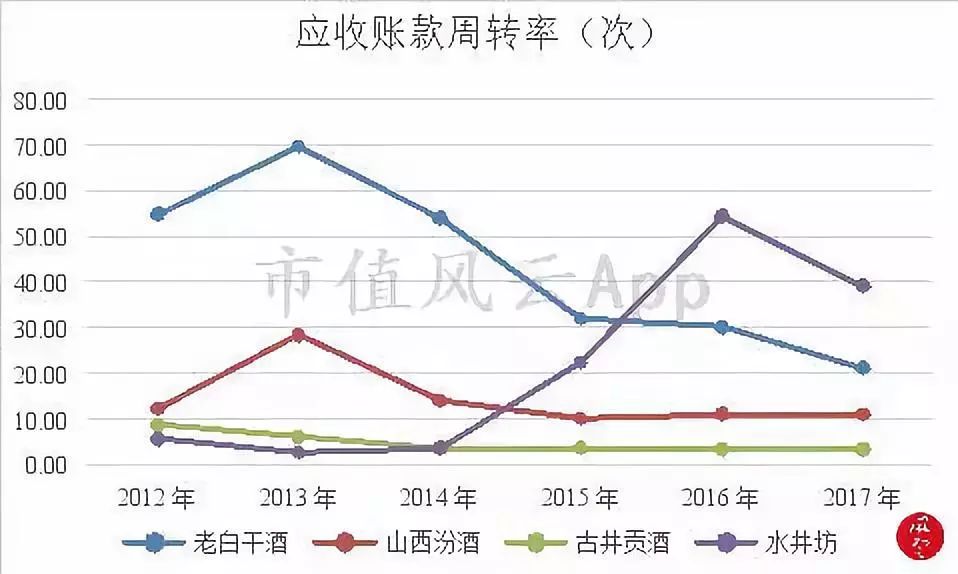 老白干酒近6年来的应收账款周转率分别为54.80次、69.55次、53.93次、31.82次、30.00次和21.00次,总体上呈现下降趋势,与同行业公司相比,处于较高水平,说明公司的销售回款质量较高,但有所放缓。