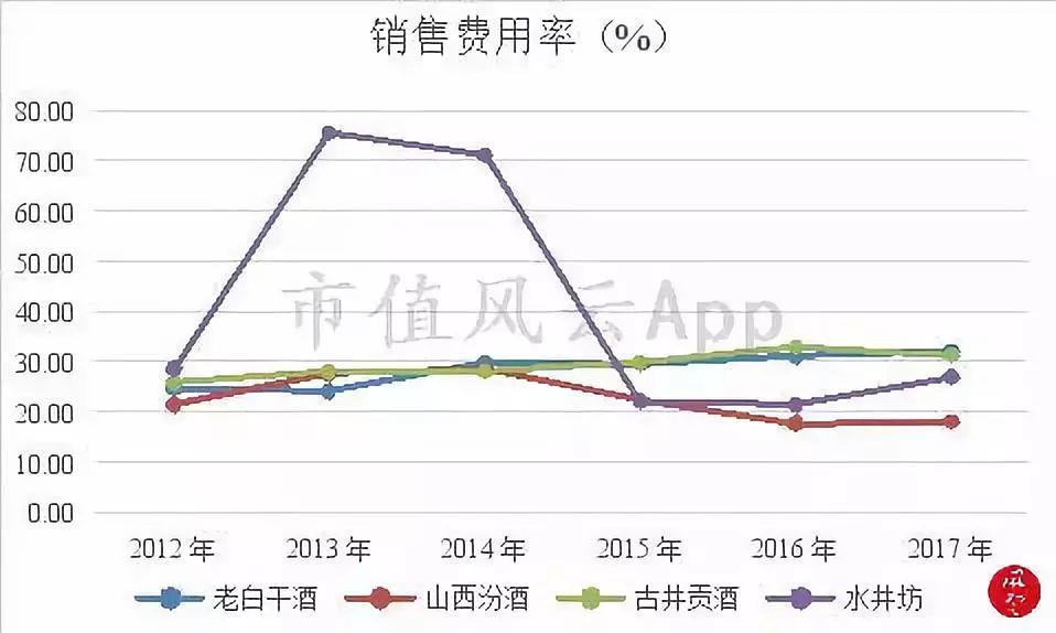 老白干酒近6年来的销售费用率水平分别为24.51%、23.85%、29.73%、29.40%、31.00%和31.99%,总体上来说呈现上升趋势,与同行业其他公司相比,处于较高水平。