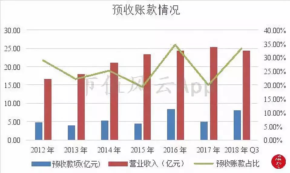 老白干酒近6年来的预收账款占当期营业收入的比例分别为28.93%、21.96%、25.23%、19.14%、34.50%和19.88%,呈现升降交替出现的趋势;截止2018年三季度末,公司的预收账款为8.08亿元,占当期营业收入比例为33.24%,与2017年相比出现显著提升。