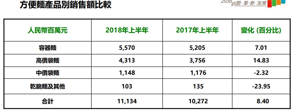 调整产品结构,布局高端产品,是康师傅业绩大幅增长的重要原因。今年上半年,康师傅容器面、高价袋面销量分别同比增加了7%左右、14.8%,而低价干脆面销量却下滑近24个百分点。