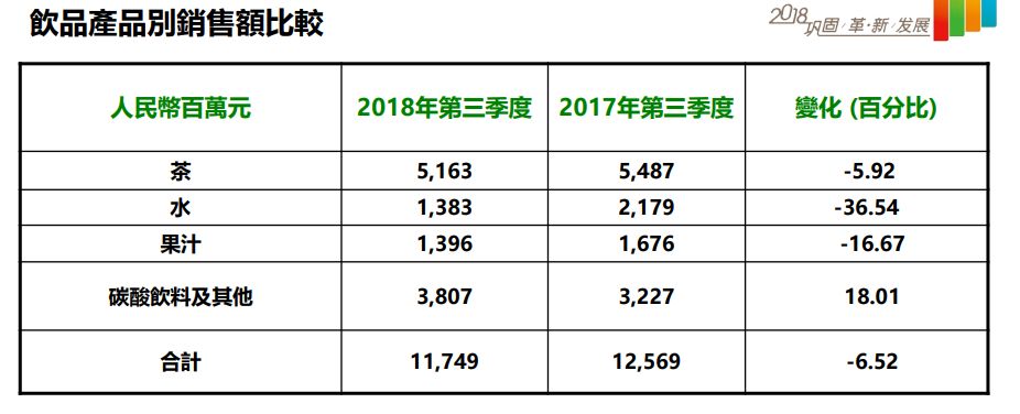 值得注意的是,据公开数据显示,2018年中国饮料行业增长平稳,前三季度中国饮料行业销量同比增长2.4%,销额同比增长4.3%。在行业大环境向好的情况下,康师傅饮料业务营收却在第三季度同比下跌。