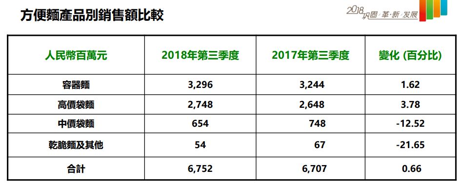 从数据上来看,相比上半年,第三季度康师傅容器面、高价袋面的增长已经明显放缓,同比增长分别为1.62%、3.78%。