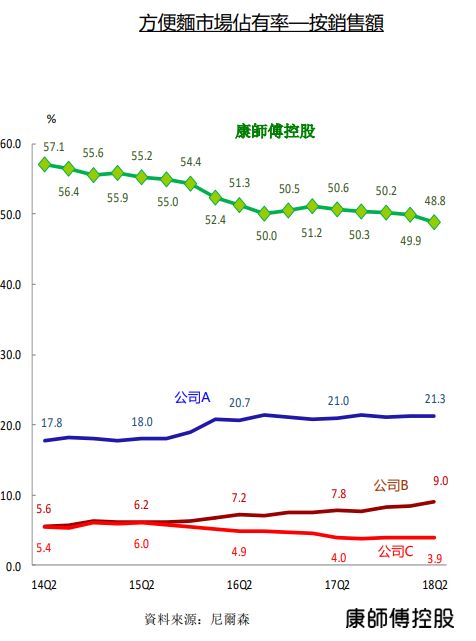 虽然康师傅目前依然是中国最大的食品和饮料生产商。但近年来,包括方便面、茶饮料、包装水在内的多个业务市场占有率持续下跌。按照销售额,康师傅方便面的市场占有率已经从2014年的第二季度的57.1%,降到2018年第二季的48.8%,4年的时间市场占有率下降近10个百分点。