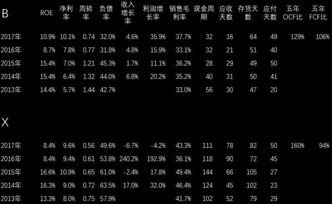 上面是两家家电企业,大家应该知道这是哪两家公司。上面这家公司的ROE、净利率、毛利率都比下面的要高。但是现金周期没有下面的好,现金流也是下面的好一点,上面是格力,下面是美的。