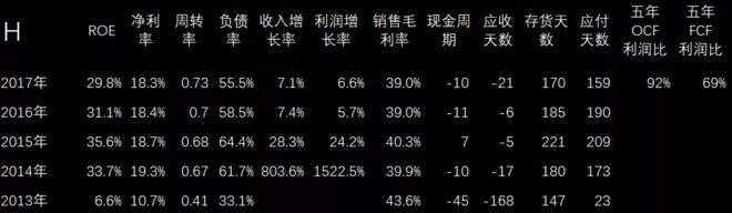 上面是A股上市的两家医药公司,两家公司2017年ROE和利润率都还不错,过去五年收入和利润增长都不错。差别是上面一家公司的负债率略高一点,毛利率下面更高一些。现金周期是用应收天数加上存货天数减去应付天数,我自己这个公式跟书上不太一样,我把应收票据算进去并且把预收减掉,书上和wind都没有减,我觉得那并不全面完整。存货和应付,我是除以主营收入作为分母,这样比较起来统一,可以非常方便地看到营运资金占用明细的情况,另外应付也是加了票据减了预付。