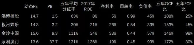 当然估值肯定不会这么简单,因为有资本支出,要看未来的发展变化。看倒数第二栏OCF(经营现金流)过去五年和净利润的比值都比较高,赌博公司有一个共同的特点是经营现金流很好。但是这几个公司近年资本支出比较大,主要是有很多新的赌场在建,其中金沙FCF比较高,和净利润相当,其他3家低一些。它们估值的关键是看投资新赌场未来回报怎么样,比如银河如果未来利润很好,分红率可以变多。也有一种可能还是维持30%的分红,有钱不给你,小股东也没有办法,过去五年它就不怎么分红。而永利也有可能未来行业不好、企业管理不善的时候,可能资金链断裂,100%多的分红不能维持。就我个人来说,金沙中国看起来更稳健一些。