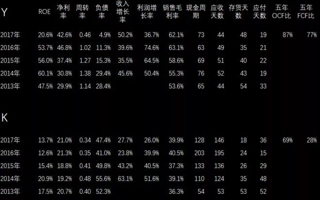再分析两家高科技企业,这都是A股上市的。看一下财务指标,上面Y公司ROE、净利润、毛利率都比下面的K要更高一些。下面K相对也很不错,周转率上面Y稍微高一些,负债率Y低一些,过去五年两家公司的收入和利润增长都非常好,绝对是成长股。现金流都还可以,虽然不是非常好,但也不是很差。我再做一个测试,认为上面这家Y公司更值得投资的请举手,认为K公司值得投资的请举手。人不多,有几个人。