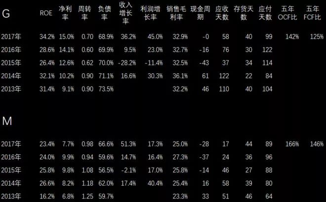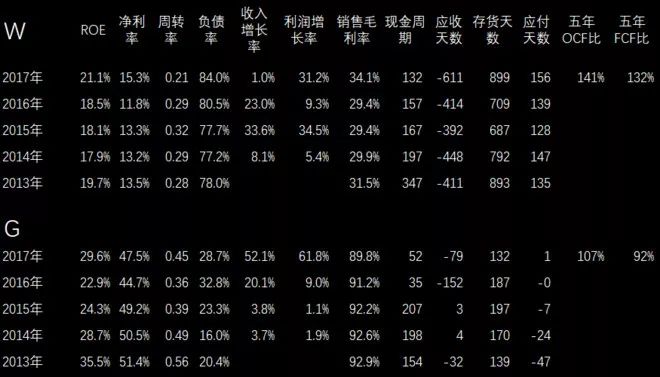 上面有两家服装企业,也都是A股上市公司。看一下财务指标,上面H公司看起来ROE、净利率都比下面S要好,但是负债率高一点。收入利润增长过去五年两家公司都不错,下面的S公司去年稍微差一点。现金流也都很不错,尤其上面一家公司现金周期是负数,等于可以占用别人的资金。