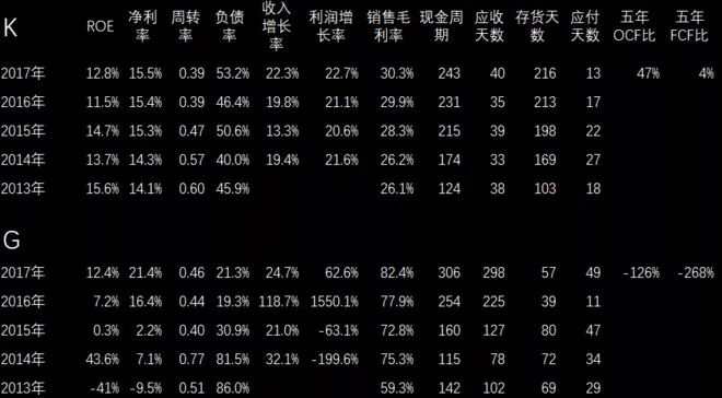 现在我想问问现场的球友,大家觉得上面的K公司更值得投资的请举手?有不少。认为下面G公司更值得投资的请举手?相对少一些。恭喜刚刚举手的球友,我想告诉大家的是这两家公司都是财务造假的公司,这里不点名。为什么?其实下面G公司非常明显,可以看到过去五年经营现金流完全是负值,自由现金流不用说,更差。上面K公司虽然是正值,但是也不特别理想,当然它造假还有很多其他的因素特征,我这里只是针对现金流做一些分析。