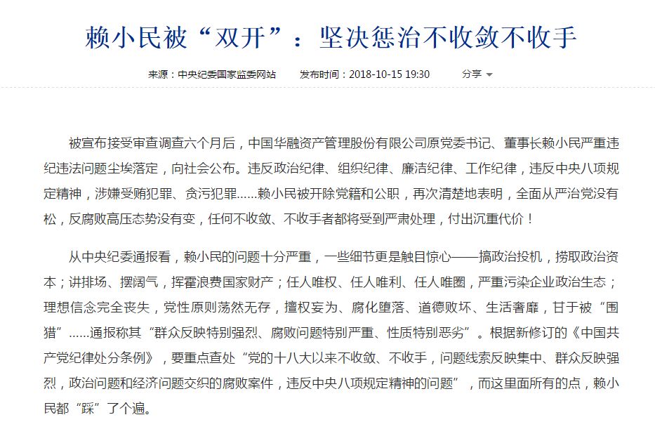 今年10月,中纪委通报了赖小民相关问题。根据中央纪委的通报,赖小民的问题十分严重,一些细节更是触目惊心——搞政治投机,捞取政治资本;讲排场、摆阔气,挥霍浪费国家财产;任人唯权、任人唯利、任人唯圈,严重污染企业政治生态;理想信念完全丧失,党性原则荡然无存,擅权妄为、腐化堕落、道德败坏、生活奢靡,甘于被“围猎”……通报称其“群众反映特别强烈、腐败问题特别严重、性质特别恶劣”。根据新修订的《中国共产党纪律处分条例》,要重点查处“党的十八大以来不收敛、不收手,问题线索反映集中、群众反映强烈,政治问题和经济问题交织的腐败案件,违反中央八项规定精神的问题”,而这里面所有的点,赖小民都“踩”了个遍。