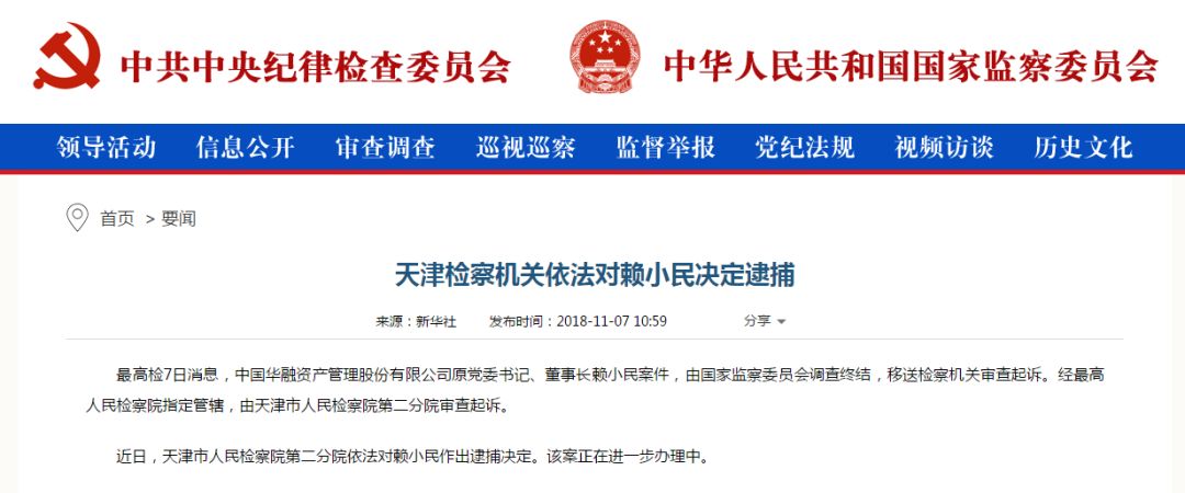 据最高检11月7日消息,中国华融资产管理股份有限公司原党委书记、董事长赖小民案件,由国家监察委员会调查终结,移送检察机关审查起诉。经最高人民检察院指定管辖,由天津市人民检察院第二分院审查起诉。近日,天津市人民检察院第二分院依法对赖小民作出逮捕决定。