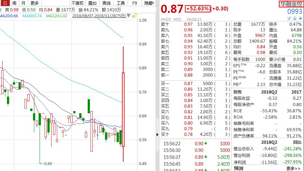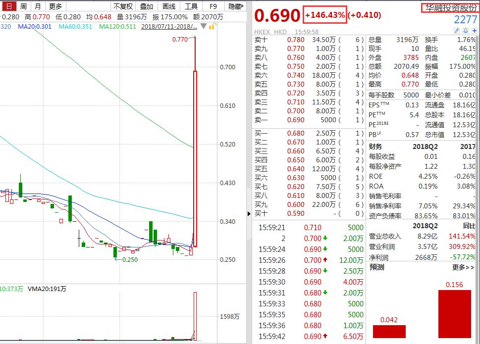 11月28日,港股华融投资股份(2277.HK)股价出现罕见暴涨,收盘较上一交易日上涨146.43%,报0.69港元,成为当天港股市场的涨幅王。