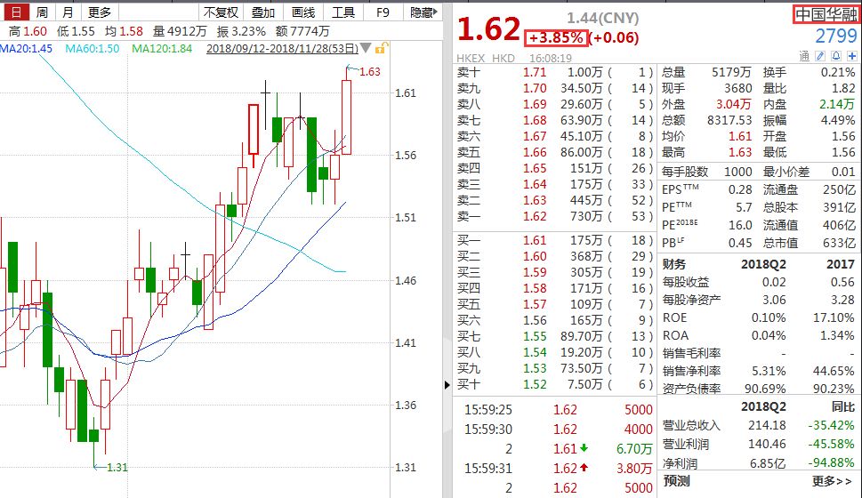 中国华融(2799.HK)股价也出现较大幅度上涨,截至今日收盘,股价上涨了3.85%,收盘价创出接近3个月新高。