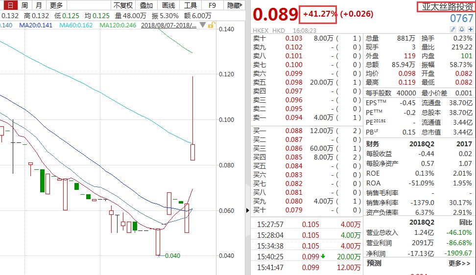 与华融系有关的上市公司股价也出现大涨,亚太丝路投资(0767.HK)今天就罕见地大涨41.27%。