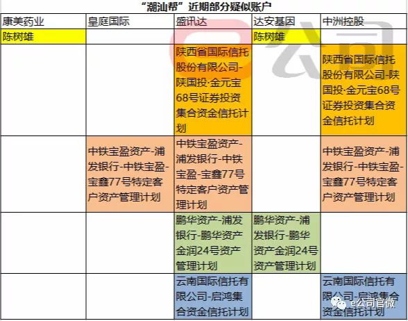 譬如,至2018年第三季度末,“陕西省国际信托股份有限公司-陕国投·金元宝68号证券投资集合资金信托计划”持有盛讯达、中洲控股;“中铁宝盈资产-浦发银行-中铁宝盈-宝鑫77号特定客户资产管理计划”进入盛迅达、皇庭国际、中洲控股的股东序列;“鹏华资产-浦发银行-鹏华资产金润24号资产管理计划”现身盛讯达、达安基因股东榜;“云南国际信托有限公司-启鸿集合资金信托计划”持仓盛迅达、中洲控股,等等。