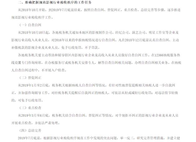 最终,税收改革政策从表演行业,延伸到了影视领域的各个行业。10月初,国家税务总局下发通知,从今年10月10日起,各地税务机关通知本地区影视制作公司、经纪公司、演艺公司、明星工作室等影视行业企业和高收入影视从业人员,对2016年以来的申报纳税情况进行自查自纠。