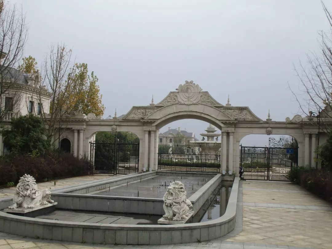 记者来到该项目主入口处看到,在高大的乳白色拱券之下,黑色铁艺大门落锁紧闭,一对石狮守候门外两侧。据守护人员介绍,该项目的确是南京佛手湖项目,现已停工,不允许任何人进入院内。