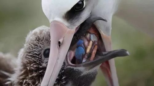 摄影师抓拍到的这张照片中,鸟妈妈将寻觅来的食物喂养到鸟宝宝嘴里,但她不知道的是,这些看起来可以吃的“食物”,有一天会害死自己的孩子。
