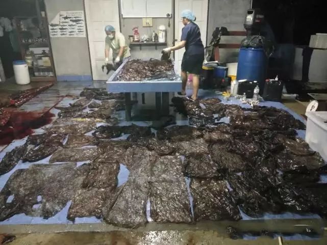 他们在鲸鱼的肚子内发现了80多个黑色塑料袋,塑料袋重达8公斤!