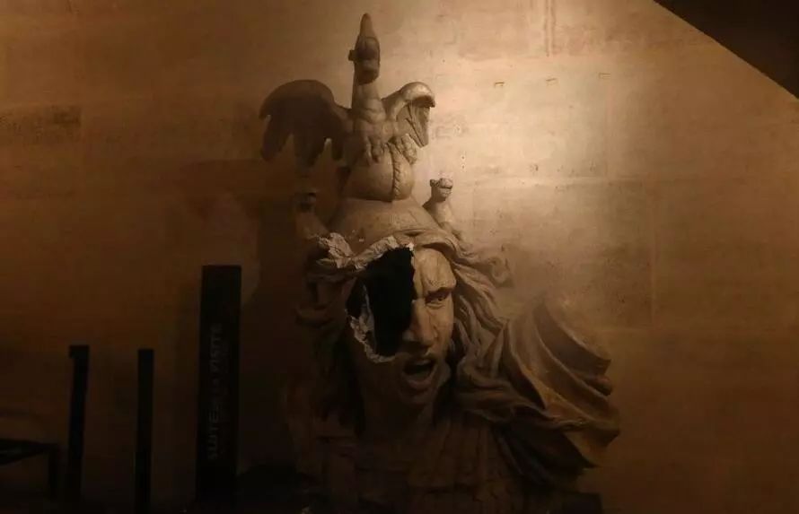 视频中显示,暴徒们冲进凯旋门博物馆实施了打砸抢行为,并且击毁了博物馆入口处,法兰西共和国的象征——玛丽安雕像。雕像大部分已经被破坏,几名身着黄背心的男子还用锤子反复敲击其他文物。
