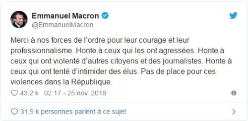 不过,马克龙对改革引发的抗议毫不妥协,他表示,已经制定好的政策不会轻易修改。还发推特宣称,法国没有这群施暴者的容身之处!