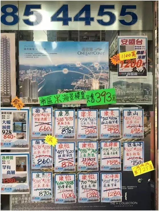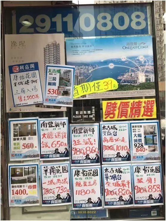 香港地产中介门口随处可见的减价甩卖房屋的广告,太古城翠湖太900万港元的房子降价80万港元,康怡花园910万港元的房子打上“狠劈”二字,卖858万港元。