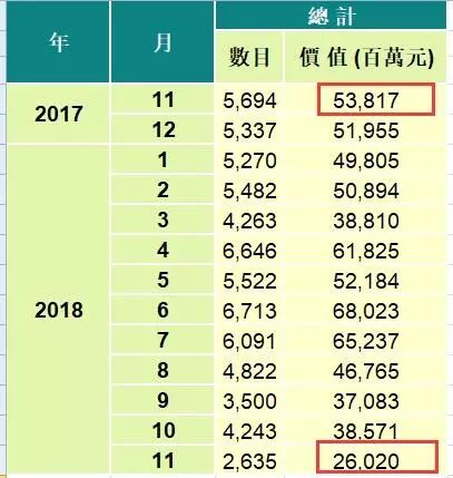2018年11月,香港楼市成交腰斩,暴跌超50%。