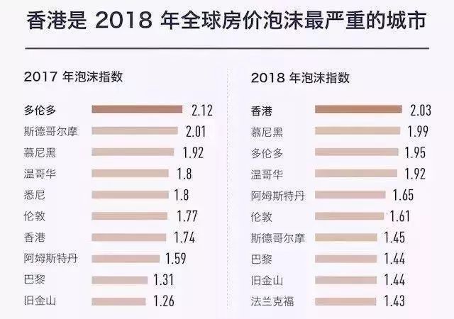 瑞银集团发布的全球房价泡沫指数排名,香港前两年还是在六七名徘徊,今年已经飙升至第一了。