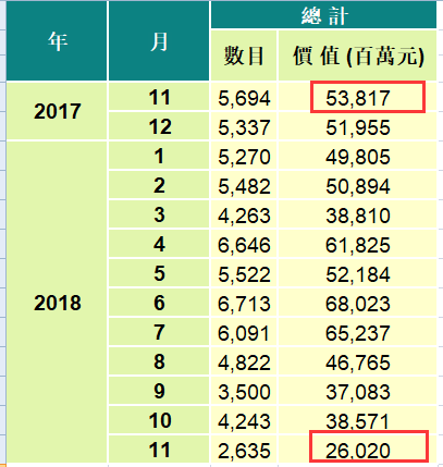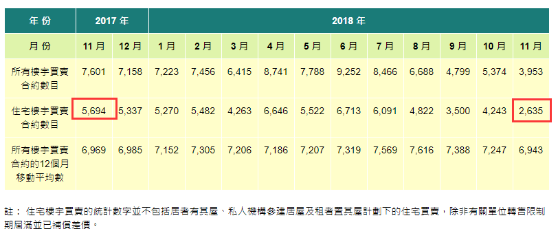 2018年11月,香港楼市成交腰斩,暴跌超50%。