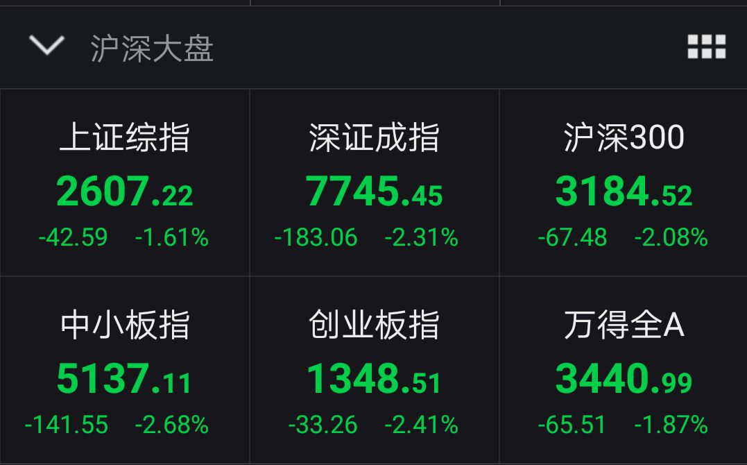 沪深两市各主要指数低开低走,截至记者发稿时,沪综指跌1.61%,深成指跌2.31%,创业板指跌2.41%。