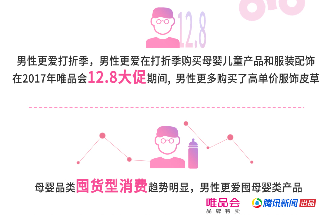 但女性与男性在促销购物中的选择仍有细微差异。女性在购物时更果断,直奔目标、按需购买、避免浪费,打折季时女性用户更爱买个护化妆用品,一线城市女性最为明显。男性作为“理性人”代表,对特卖中高价值的产品更加敏感,在2017年的唯品会128大促中,更多男性用户购买了高单价的皮草;此外,还有不少奶爸选择在打折季大量囤货母婴儿童用品。