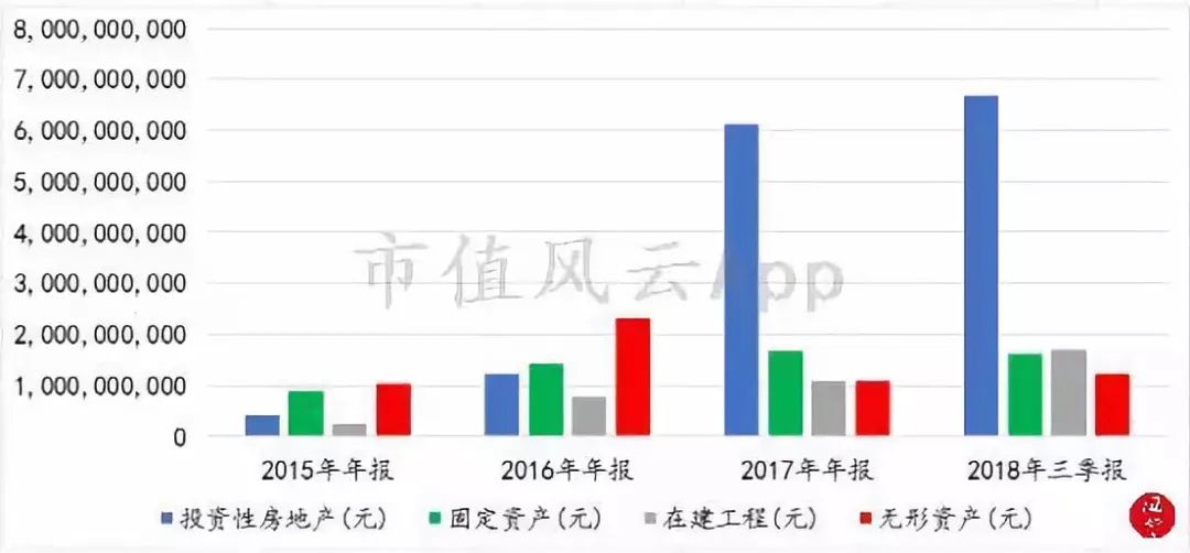 从图中,可以非常明确的看到,投资性房地产在猛增(从2015年的4个多亿,到2018年三季度接近67个亿),而与之相对应的是,固定资产近期微降,无形资产从2016年(约23个亿)到2017年(约10.8个亿)有一个较大降幅后,近期也仅略有上升(到三季度约12.37亿)。