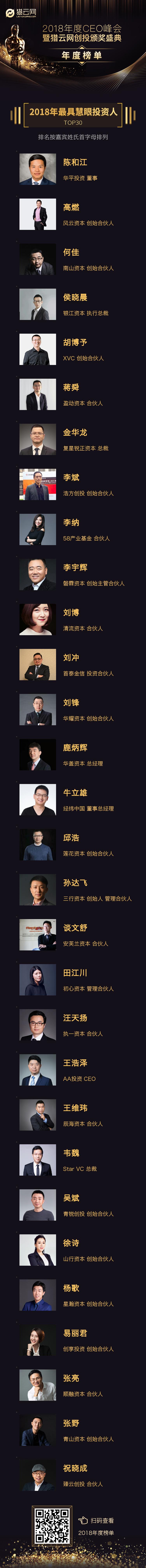 以下为 “2018年最具慧眼投资人TOP30”榜单(排名不分先后)