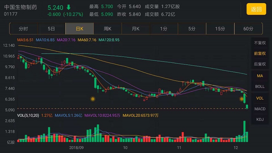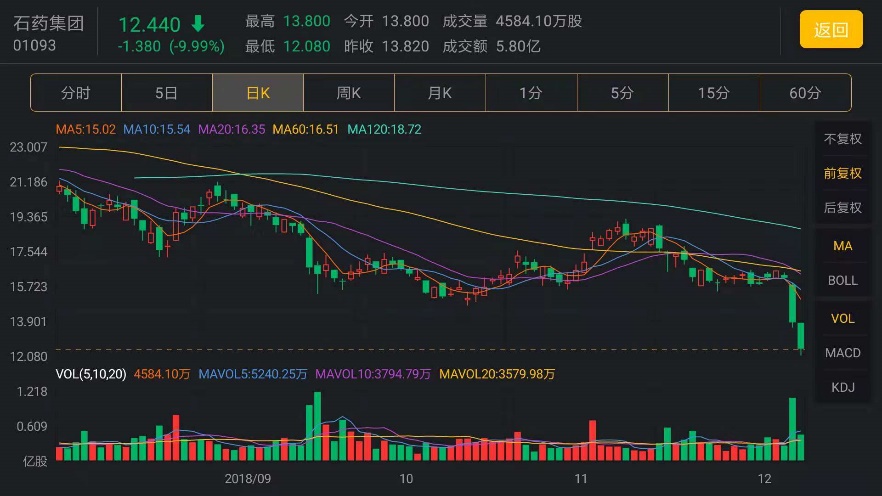以中国生物制药制药和石药集团为例AH医药板块昨日全线重挫,三生制药等均跌1成以上,两家蓝筹药企石药集团及中国生物制药齐创52周低位。石药昨收报13.82元,成交达16亿元,同日在市场斥资2784万元回购,每股作价13.68至14.06元;中生制药收报5.84元,成交达16.2亿元。我比较熟悉港股医药板块,而中生、石药是个中龙头,在此拿它俩举例说明。