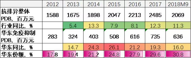 1. 抗排异整体市场仍在稳定增长(2012-2017年PDB销售GAGR=9.4%、2018M9同比+11.3%);