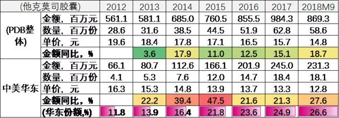 从上表的PDB销售情况可以看到,拜耳阿卡波糖维持最高价格,份额从2012年的82.4%降到2018M9(前九个月)的66.1%;华东价格其次,份额从2012年的15.8%升至2018M9的29.9%;