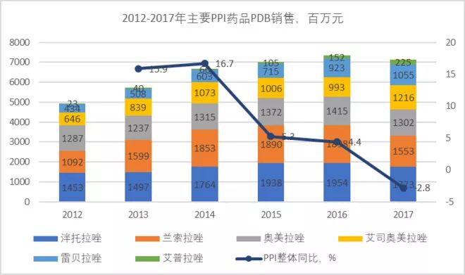 但雷贝拉唑的增速也放缓,而兰索拉唑、奥美拉唑也出现了类似的萎缩;
