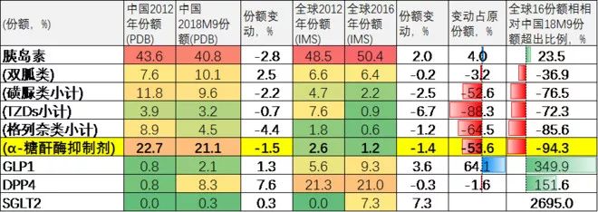 比如α-糖酐酶抑制剂在中国PDB样本医院控糖药市场中的份额,从2012年的22.7%降到2018M9的21.1%,但在全球IMS控糖药市场的份额由2012年的2.6%降到2016年的1.2%(创药网引IMS数据)、份额腰斩、仅略高于中国份额的1/20,意味着如果中国控糖药市场如果向全球控糖药格局趋同,那α-糖酐酶抑制剂的份额还有超90%的下行空间。