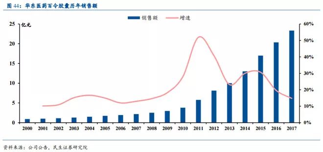 上图是民生证券按公告测算百令胶囊历年销售值,2014-2015年都还有30%增长,2016年20%左右增长过20亿,2017年15%左右增长到约23亿元;据平安证券,2018年前3个季度是12%左右增长。增速下滑,但还保持增长。