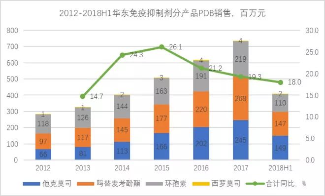 环孢素的竞争压力,介于吗替麦考酚酯和他克莫司之间。环孢素整体份额有向他克莫司流失的趋势,但华东医药因为持续快速的份额提升,在2012-2017年保持了快速的增长,2018年前9月增速显著回落,但如果这边的增速回落能在他克莫司上得到补偿,问题倒也不大。