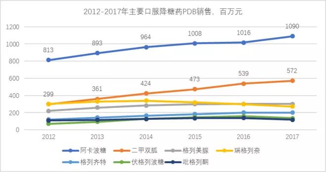 阿卡波糖2017年PDB销售10.9亿、遥遥领先其它口服降糖药、也接近口服降糖的“金标准药物”二甲双胍的2倍;2017年阿卡波糖销售5.9亿片、与7.1亿片销售的二甲双胍,是唯二超2亿片销售的口服降糖(瑞格列奈1.8亿、格列美脲0.9亿),可见阿卡波糖在降糖领域的江湖地位。