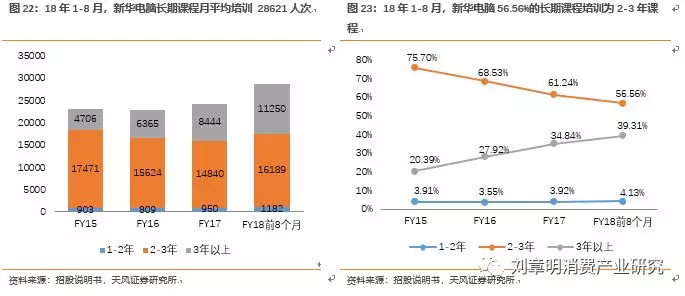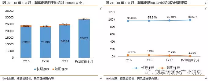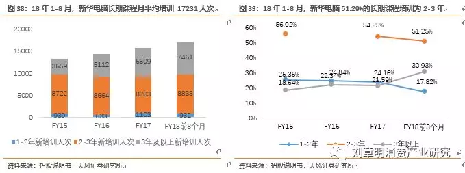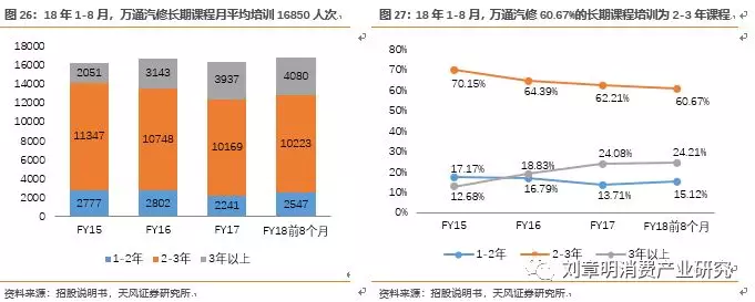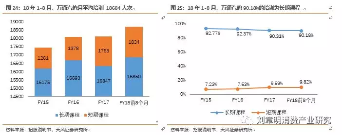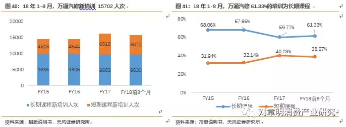 同样提供长期课程和短期课程的新华电脑和万通汽修情况相同,长期课程培训人次也占总培训人次的主体,占比都达到了90%以上。FY18前8个月新华电脑长期课程培训人次为28621人次,占总培训人次比重为98.67%,创造历史新高。