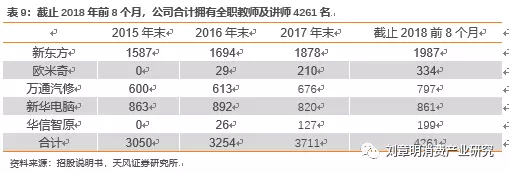 公司目前全职讲师4261人,生师比28.5:1,其中新东方烹饪老师1987人,新华电脑861人,万通汽修797人。