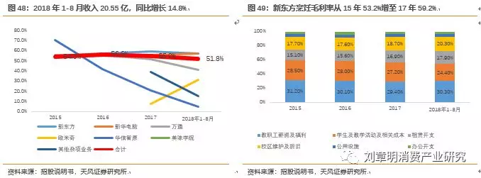 东方教育2015-17年及2018年1-8月毛利率分别为54.0%、56.6%、55.0%及51.8%,毛利率15-17年减少主要系2017年运营39所新学校及于截至2018年8月31日止运营21所新学校,一般而言建立新学校会对毛利率产生不利影响。新学校开始营运的初始过渡期间,我们产生巨额的教职工薪资及福利、教学活动成本、租赁开支及其他固定成本,而新学校的初始收入由于初始培训人次相对较少而有限。具体来看,