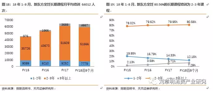 考虑到欧米奇、华信智原、美味学院只提供短期课程,所以这两家短期课程培训人次占总培训人次的比重为100%。对于提供长期课程和短期课程的新东方烹饪而言,长期课程培训人次占总培训人次的主体(FY18前8个月占比为91.44%,创造历史新高,下同),对于64012人次。