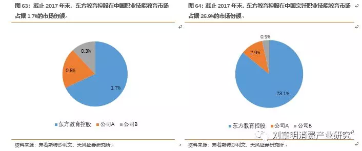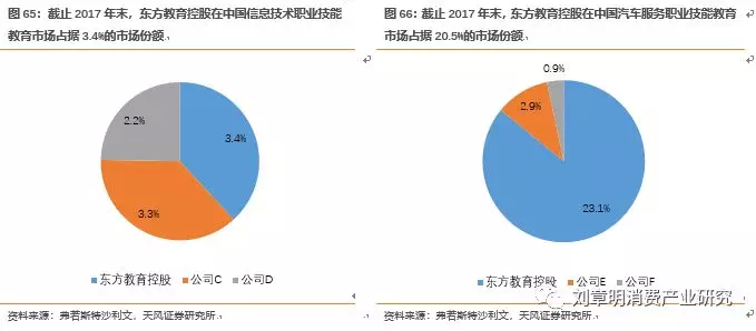 中国的信息技术职业技能教育市场相对分散,就2017年平均培训人次而言,前三大市场参与者占有9.9%的市场份额。截至2017年12月31日,东方教育控股在信息技术职业技能教育市场中份额最高,平均培训人次为21442人次,占有3.4%的市场份额;汽车服务职业技能教育相比信息技术集中,就2017年平均培训人次而言,前三大市场参与者占有20.5%的市场份额。截至2017年12月31日,公司在汽车服务职业技能教育市场中占据最大市场份额,平均培训人次为15236人次,占有9.7%的市场份额。