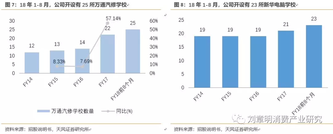 得益于公司的快速扩张,其学校总数由FY14的63家增长到18年1-8月的139家。分学校看,新东方烹饪学校在公司校园网络内数量最多,由FY14的由FY14的32家增长到18年1-8月的50家;万通汽修次之,由FY14的由FY14的12家增长到18年1-8月的25家。