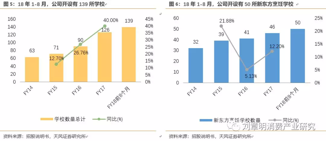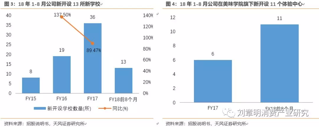 扩张节奏上,公司分别于FY15、FY16年、FY17年及18年1-8月开设8所、19所、36所及13所新学校;同时在FY17、18年1-8月在美味学院旗下分别开设6个、11个订制烹饪体验中心。