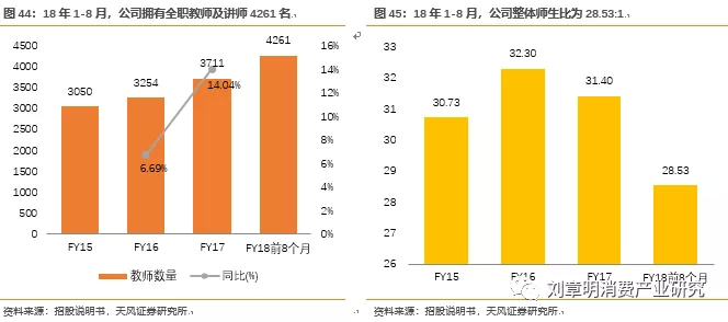 公司的教师招聘程序具有高度选择性:在招聘一名教师或一名讲师之前,公司通常会考虑其教学经验、行业经验、教育背景及资质或证书。截止FY15、FY16、FY17、18年1-8月,公司分别拥有3050名、3254名、3711名、4261名全职教师及讲师,所有教师及讲师在相关行业平均拥有五年经验,其中约66.5%已获大专及以上文凭。同时教师流动率处于较低水平。FY15、FY16、FY17、FY18前八个月,全职教师的流动率呈现逐步走低的态势,分别为17.4%、17.0%、16.6%、14.0%。
