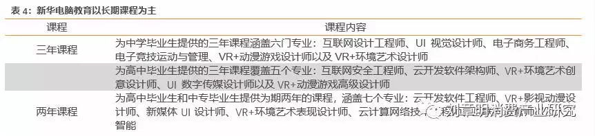 新华电脑教育以长期课程(包括职业培训教育课程及职业中专教育课程)为主,课程时长主要介于三个月至三年之间。